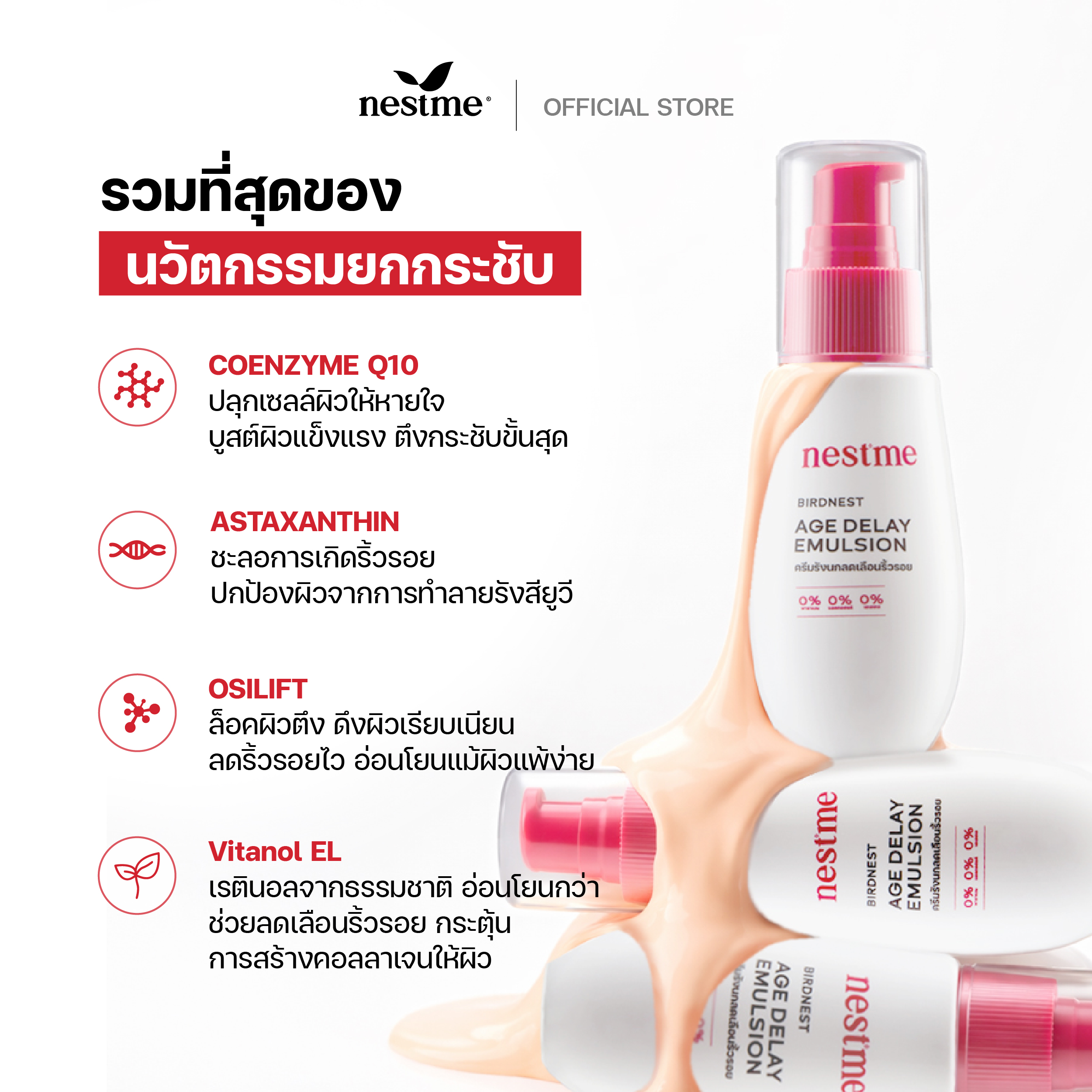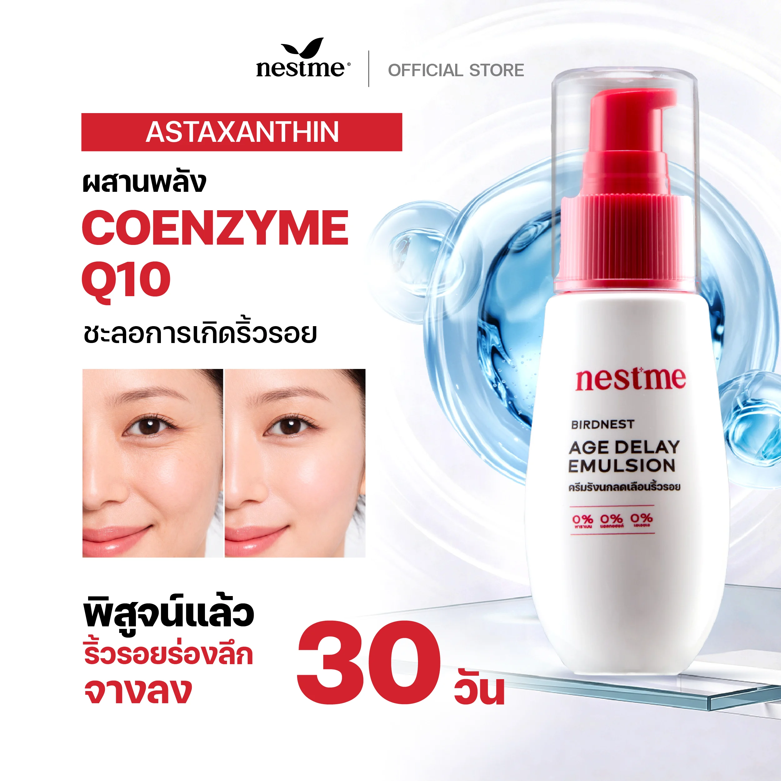 The Age delay emulsion concentrated with Axstaxanthin and Coenzyme Q10, the powerful antioxidant helps delay skin aging and wrinkle formation.